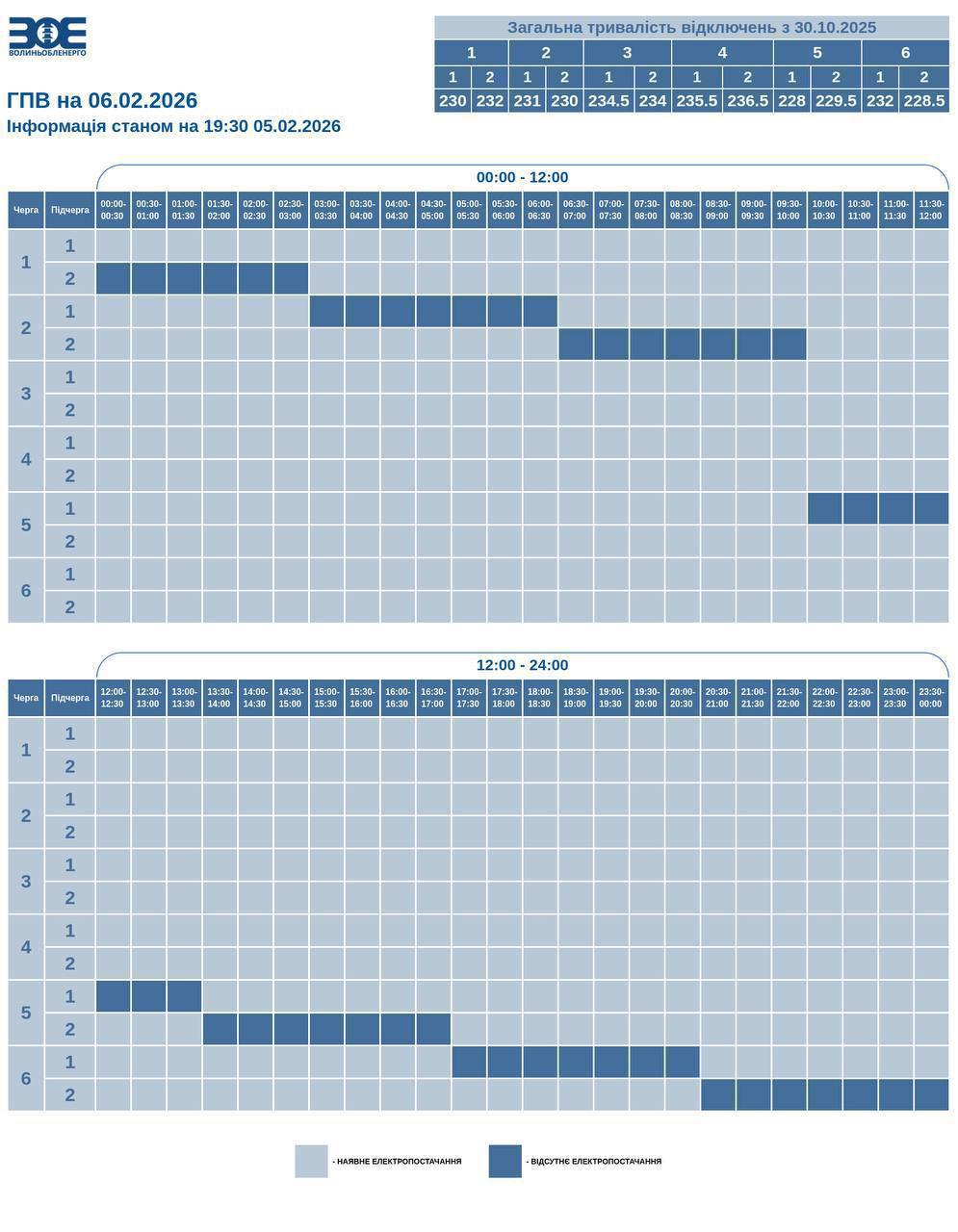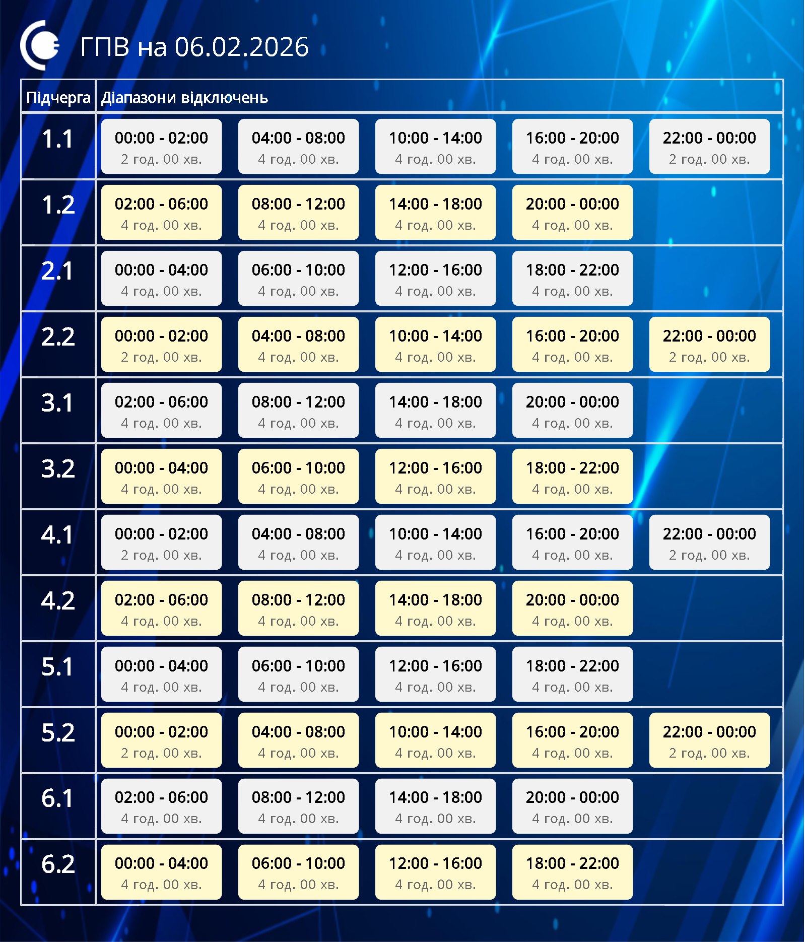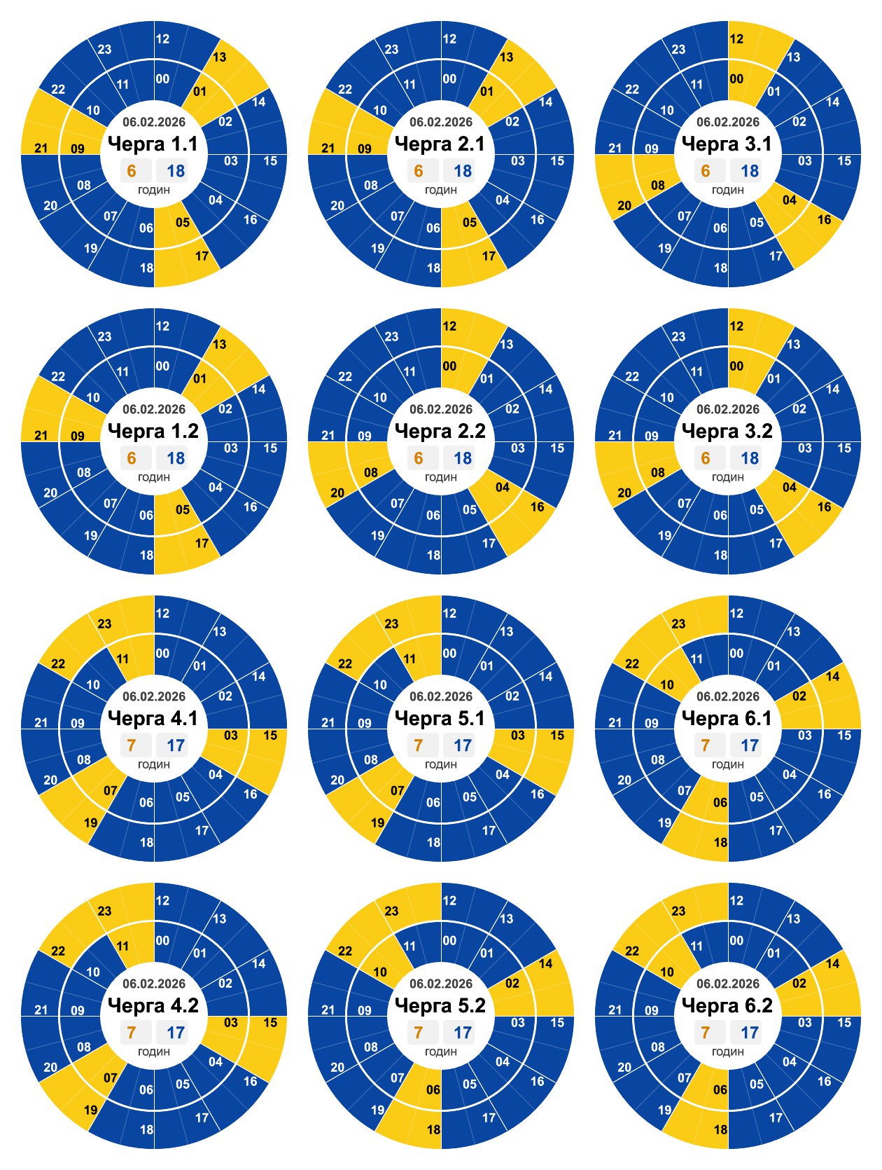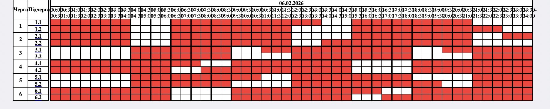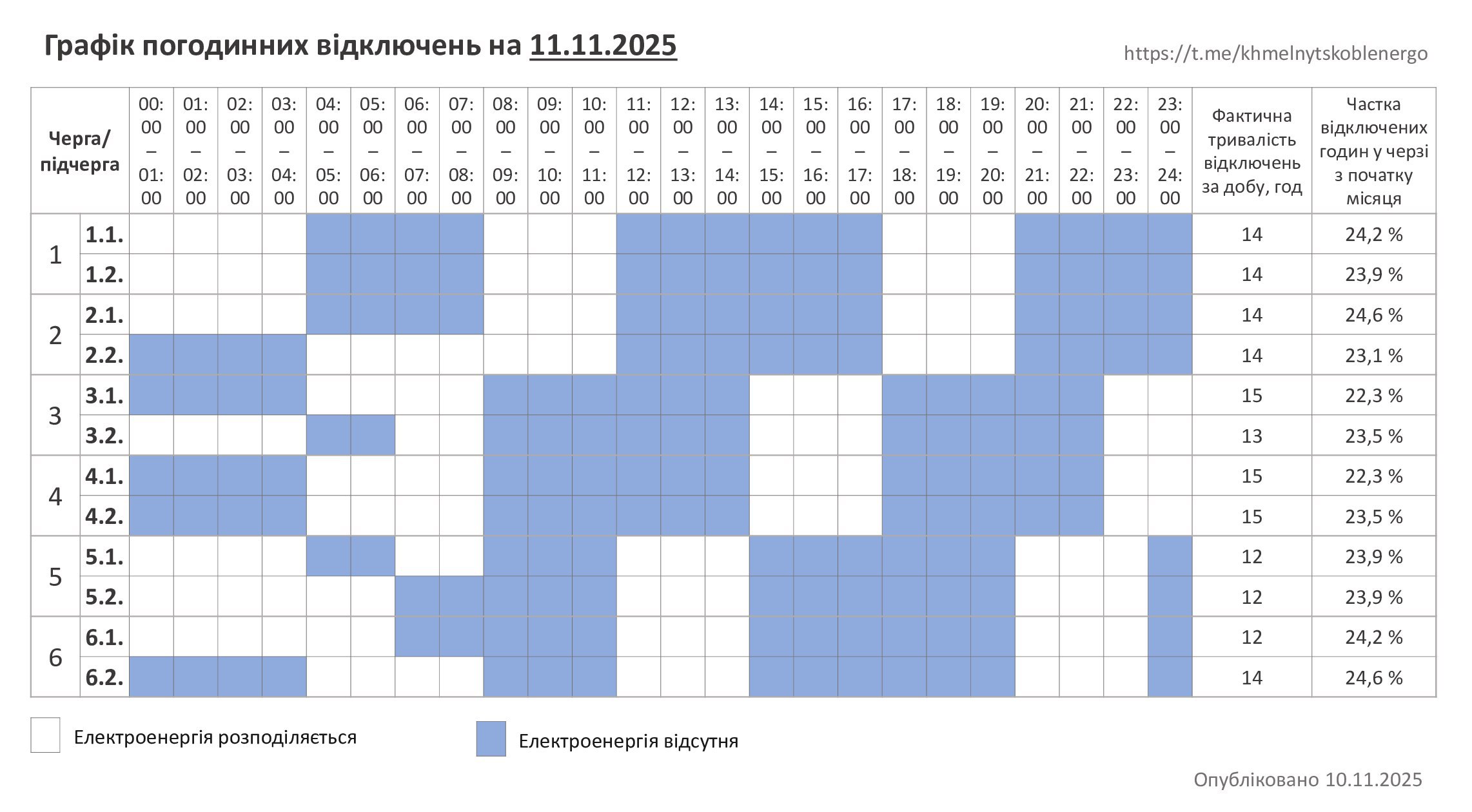 Протягом доби час і обсяг відключень можуть змінюватися залежно від ситуації в енергосистемі. Щоб бути в курсі, перевіряйте актуальні графіки на сайті або офіційних сторінках вашого обленерго. Зазначимо, що графіки на окупованих територіях не діють, також від графіків не залежить відключення світла на Луганщині та в інших зонах бойових дій.