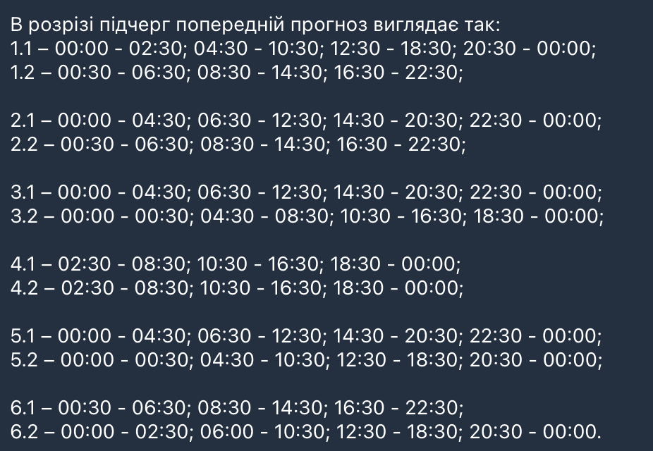- Графіки нерівномірні у різних районах через особливості пошкоджень енергосистеми.