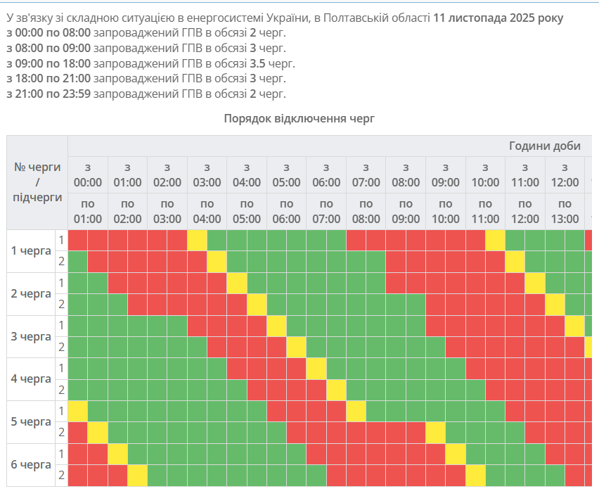 Графік погодинних вимкнень електроенергії в Полтаві та Полтавській області за посиланням, детальну інформацію знайти можна на сайті АТ "Полтаваобленерго".
