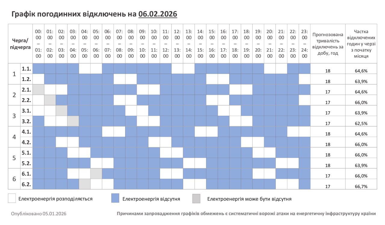 Світло буде всього кілька годин. Які графіки діють по Україні 6 лютого