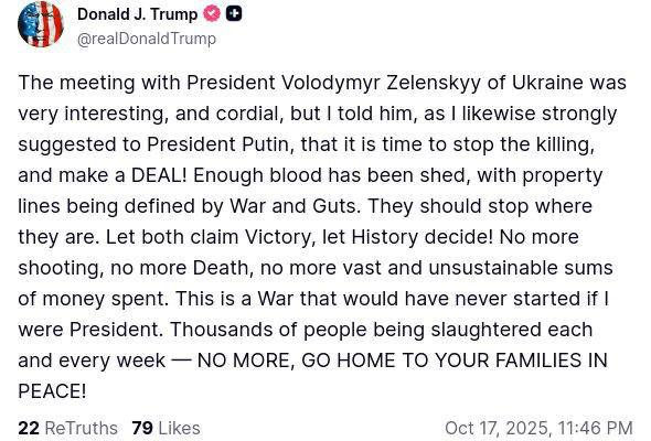 "Зустріч із президентом України Володимиром Зеленським була дуже цікавою та сердечною, але я сказав йому, як і наполегливо радив Путіну, що настав час припинити вбивства та укласти угоду! Досить кровопролиття, досить визначати кордони війною та відвагою. Вони повинні зупинитися там, де перебувають зараз. Нехай обидві сторони оголосять про перемогу, а історія розсудить! Більше ніяких пострілів, ніякої смерті, ніяких величезних і непідйомних витрат. Ця війна ніколи б не почалася, якби я був Президентом. Тисячі людей гинуть щотижня — досить, повертайтеся до своїх родин у мирі!", — написав він.