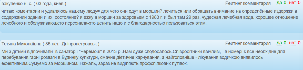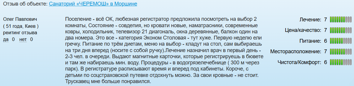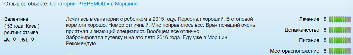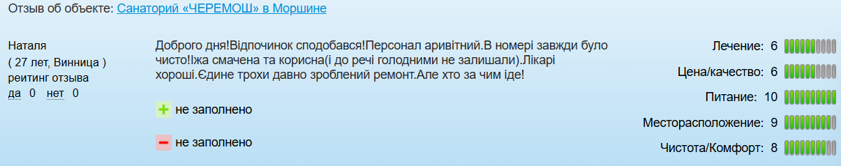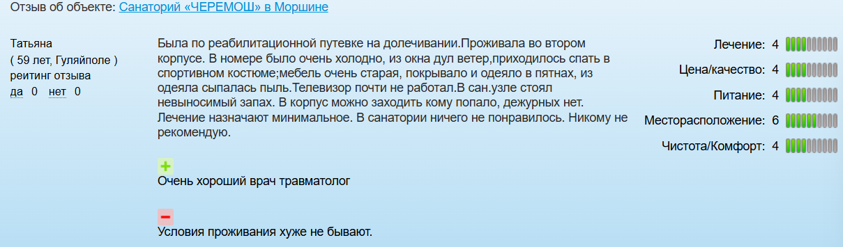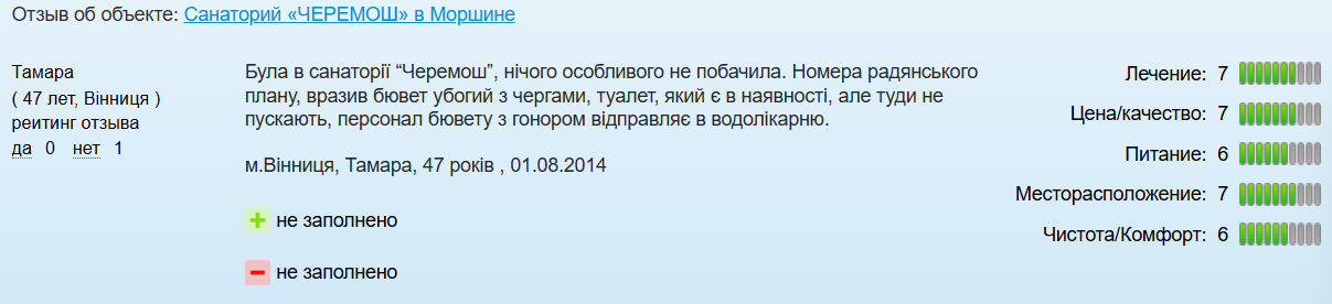 Серед відгуків пацієнтів на оздоровлення у санаторії були як негативні, так і цілком схвальні. Хоча й датовані вони 2014 роком.