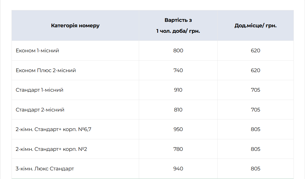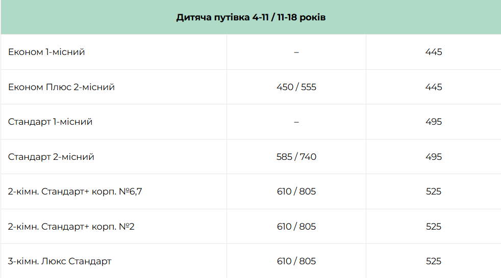 Ціни на поселення для дорослих починаються від 740 гривень/доба. Діти до 4 років проживають з батьками безкоштовно, без надання додаткового місця і без лікування.