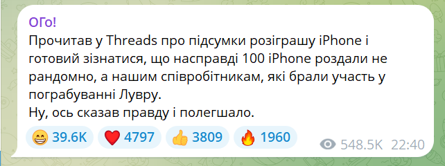 Прочитав у Threads про підсумки розіграшу iPhone і готовий зізнатися, що насправді 100 iPhone роздали не рандомно, а нашим співробітникам, які брали участь у пограбуванні Лувру. Ну, ось сказав правду і полегшало, — іронізує Гороховський