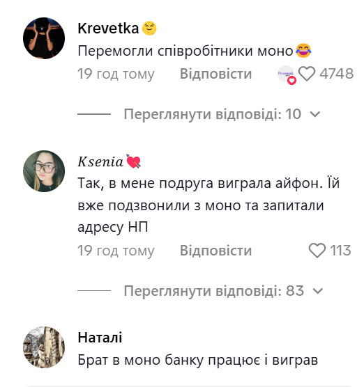 У соцмережі TikTok з'явилося чимало відео, в яких українці діляться сумнівами щодо того, як було названо переможців. Багато хто підозрює, що їх обрали не рандомно, а, наприклад, серед співробітників "Монобанку".