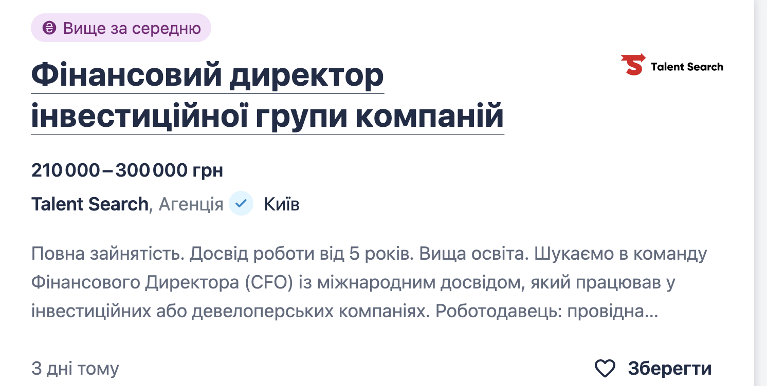 - Фінансовий директор інвестиційної групи компанії може отримувати зарплату до 300 тисяч грн. Але ця посада вимагає досвіду роботи понад 5 років та покриття досить великого об'єму обов'язків.