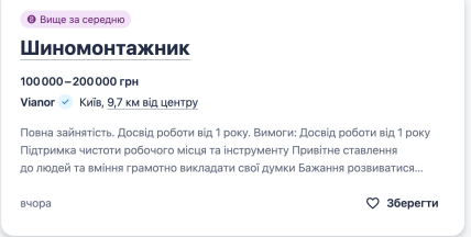 - Шиномонтажнику в Києві з досвідом роботи від 1 року обіцяють зарплату до 200 тисяч грн.