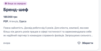 - Бренд-шеф — стратегічний лідер у ресторанному бізнесі, який відповідає за створення та підтримку унікальної концепції, меню та гастрономічного досвіду закладу чи мережі. За таку посаду обіцяють до 200 тисяч на місяць.