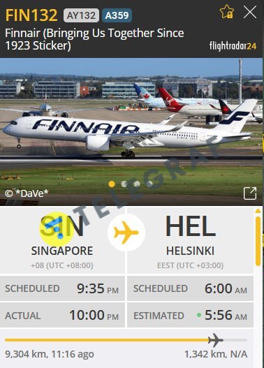 Відомо, що літак Airbus A350-941 здійснював політ із Сінгапуру до Гельсінкі.