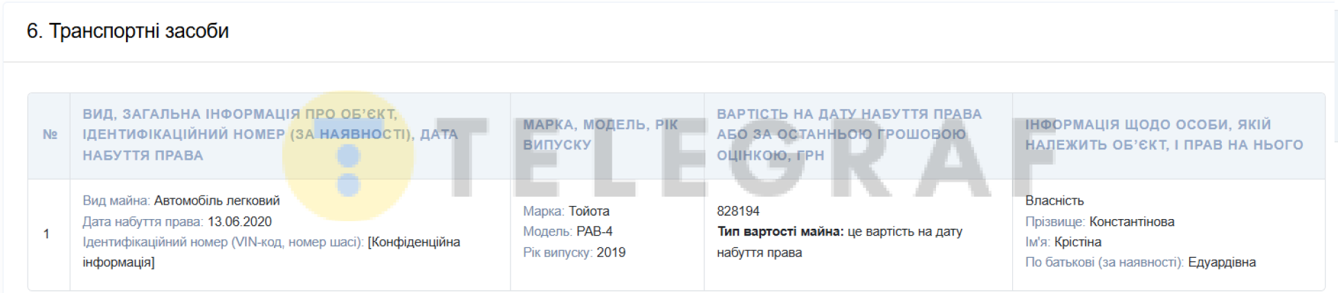 За звітний рік Константінова отримала 2 020 837 гривень заробітної плати, а також близько 410 тисяч гривень аліментів на дітей. Окремо вона задекларувала 1 тисячу гривень процентів від депозитів у "ПриватБанку".