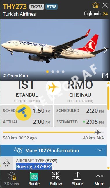 Зазначається, що Boeing 737-8F2 летів зі Стамбула до столиці Молдови Кишенів. Цей літак є модифікацією сімейства Boeing 737 Next Generation (737NG), а саме варіанта Boeing 737-800. Зазвичай на борту 162-189 місць для пасажирів (2-класне компонування: бізнес + економ).