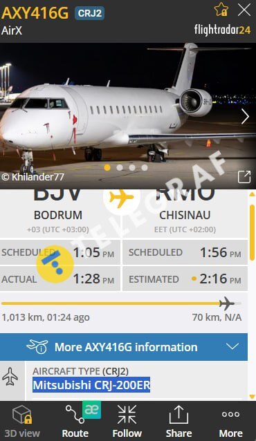 Другий літак зафіксований над Одеською областю, Mitsubishi CRJ-200ER. Він летів з турецького міста Бодрум до Кишенева. Цей літак є регіональним реактивним літаком, створеним канадською компанією Bombardier Aerospace, але сьогодні належить японській Mitsubishi Heavy Industries.