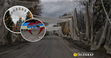 Досить добре на фото видно, як вже зносилась антидронова сітка, якою обвішали "дорогу життя" до Костянтинівки. Однак вона й досі працює, та дозволяє місцевим безпечно пересуватись, хоча й має чимало прогалин.