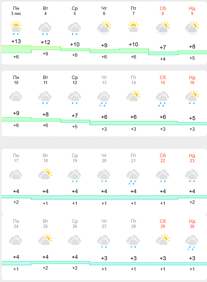 Водночас у великих містах температура може і не піти нижче нуля. Згідно з прогнозом на листопад, у Києві вночі після похолодання очікується +1 та +2 у деякі дні.