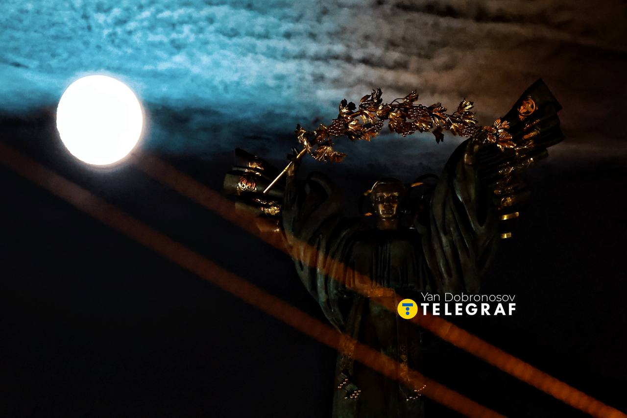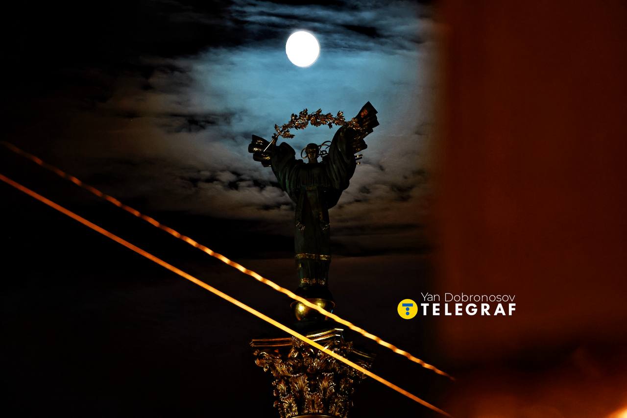 Безхмарне небо дало можливість поспостерігати, як місяць поступово сходив над Хрещатиком та освітлював фігуру Берегині на Монументі Незалежності.