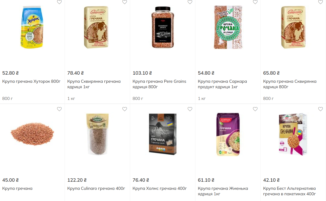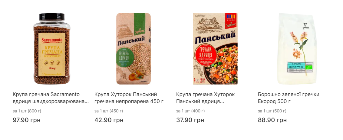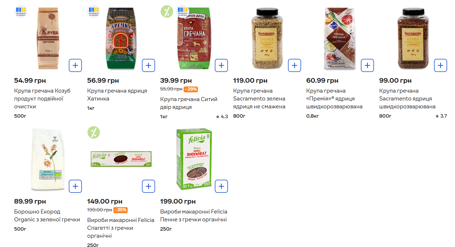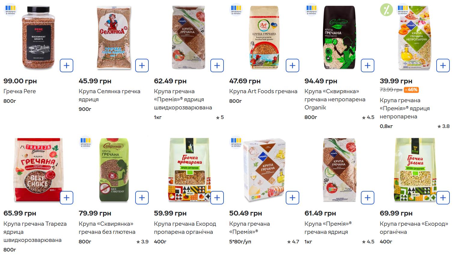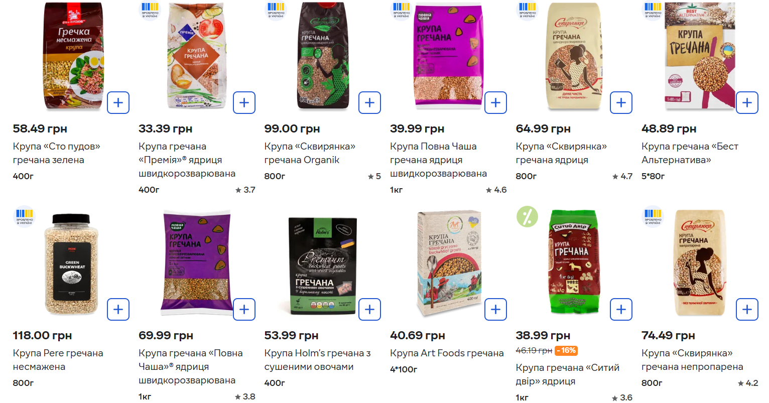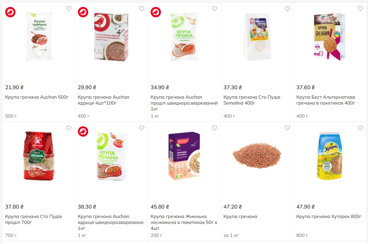 У мережі магазинів Auchan кілограмова пачка гречаної крупи власної торгівельної марки коштує 34.90 грн. Одночасно ціна на розсипну нефасовану крупу вже стоїть 47.20 грн. При цьому упаковка крупи гречаної непропареної органічної об'ємом 800 грамів коштує 91.50 грн, але її вже немає в наявності.