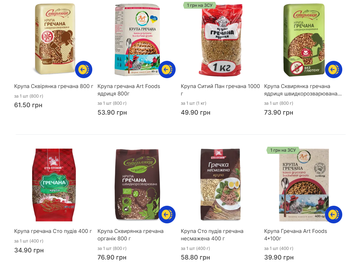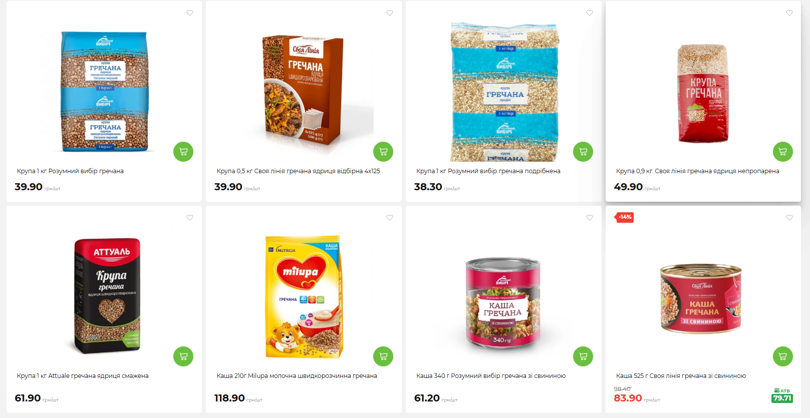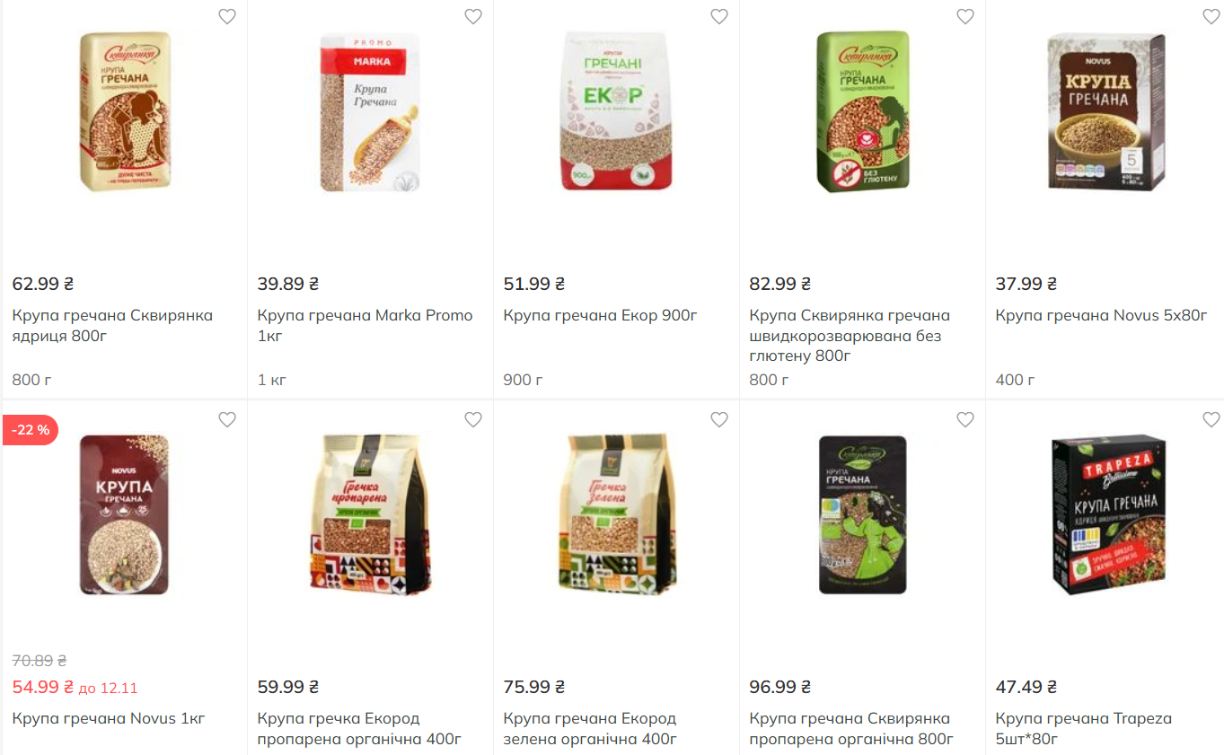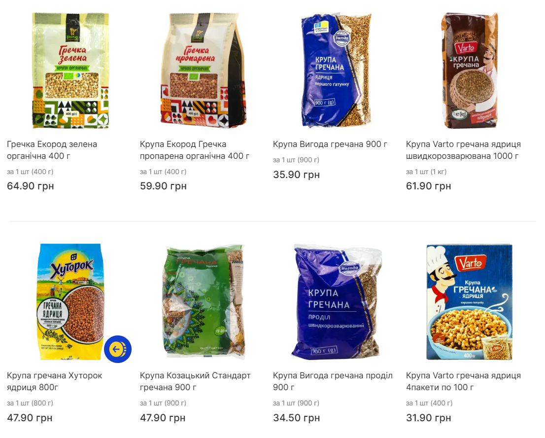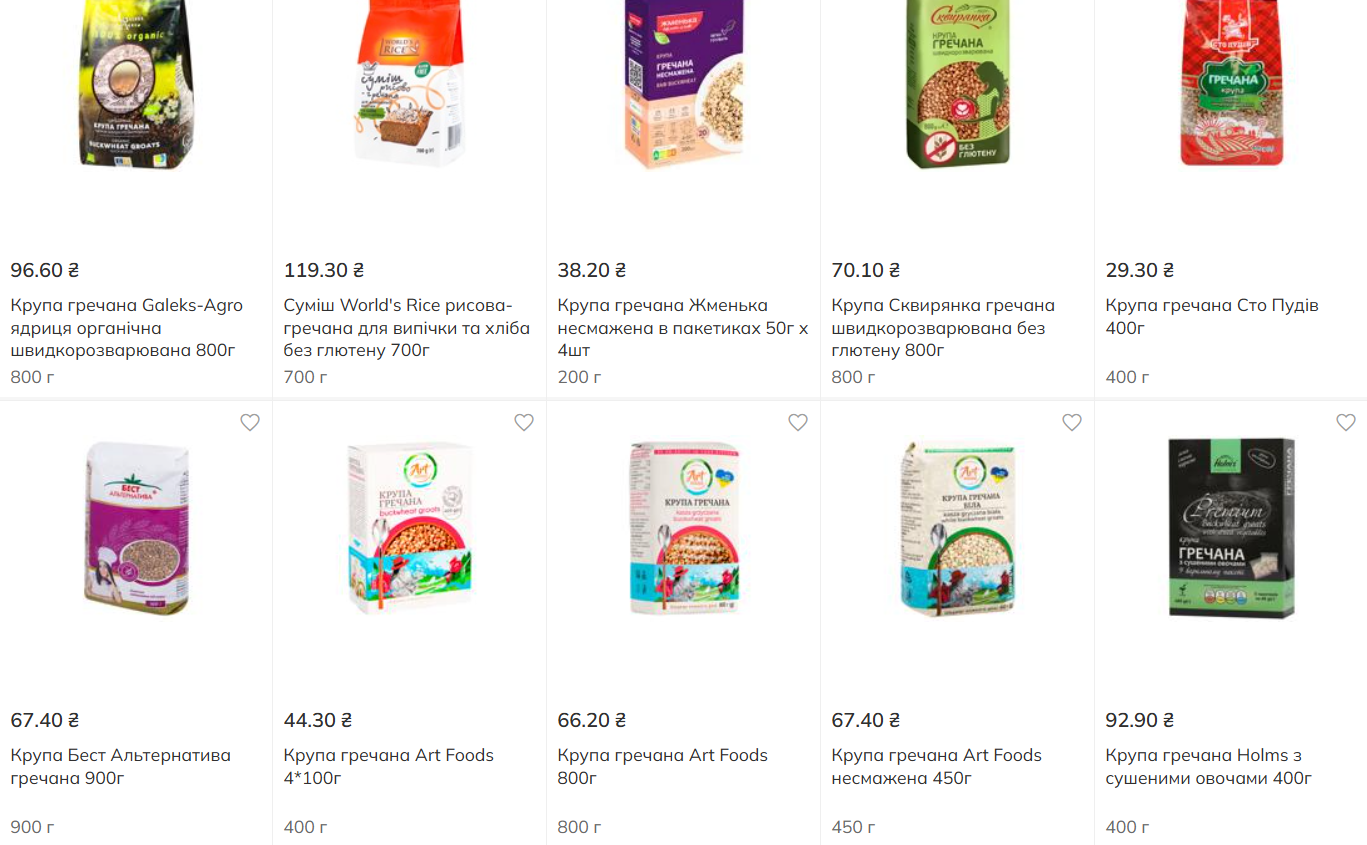 У мережі магазинів Auchan кілограмова пачка гречаної крупи власної торгівельної марки коштує 34.90 грн. Одночасно ціна на розсипну нефасовану крупу вже стоїть 47.20 грн. При цьому упаковка крупи гречаної непропареної органічної об'ємом 800 грамів коштує 91.50 грн, але її вже немає в наявності.