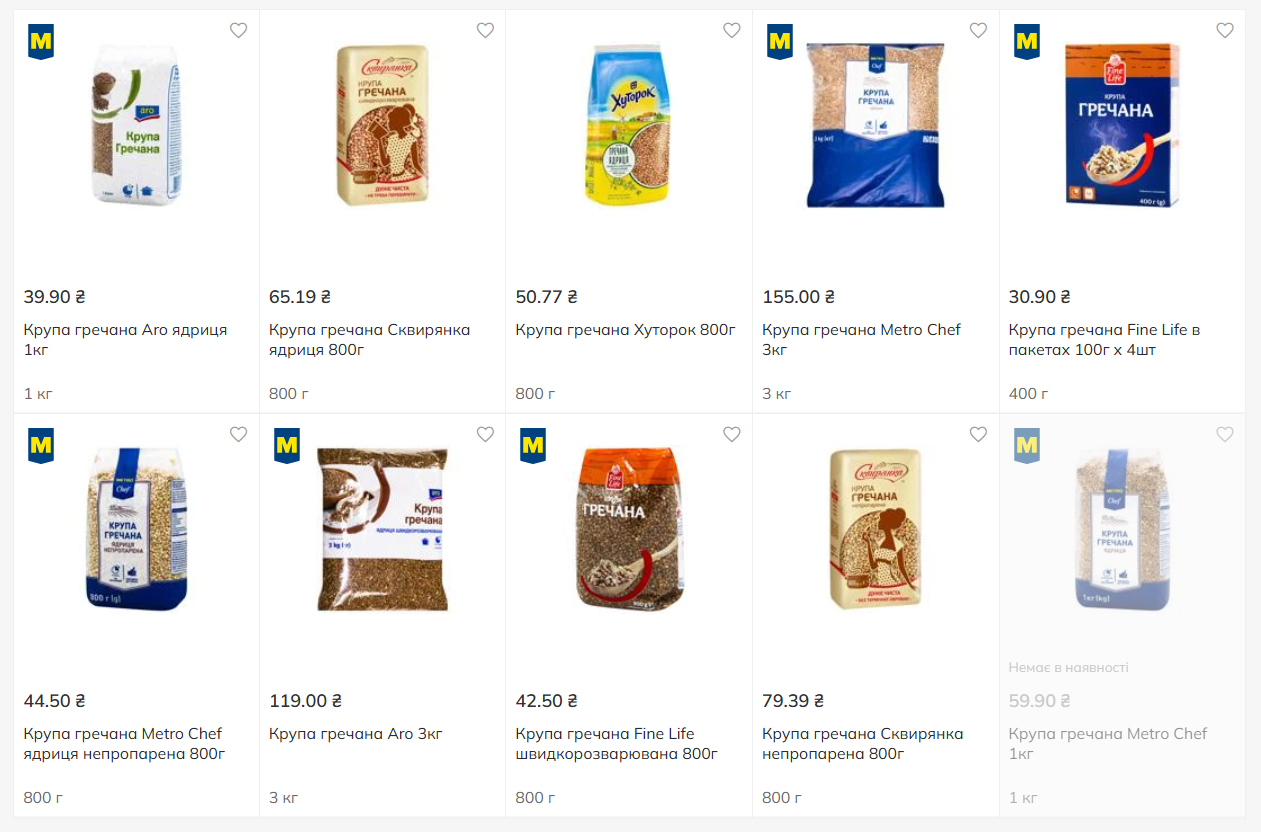 Вищезгадана непропарена гречка у Metro присутня, й коштує вона там навіть дешевше, лише 79.39 грн. Натомість там немає "фірмової" кілограмової продукції, яка, судячи з цінника, коштує 59.90 грн. Утім, можна придбати упаковку одразу на три кілограми. І це буде вигідніше, аніж купувати три пачки вагою у кілограм.