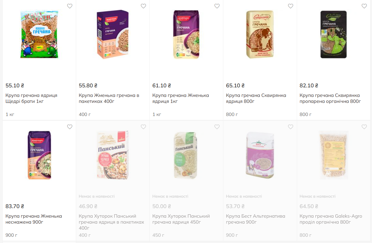 Megamarket наразі пропонує покупцям широкий вибір гречки від різних виробників. Пропозиції магазину складають аж 31 наявну позицію. Кілограм розсипної крупи коштує 45.00 грн, а упаковка — 54.80 грн.
