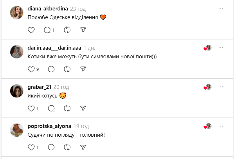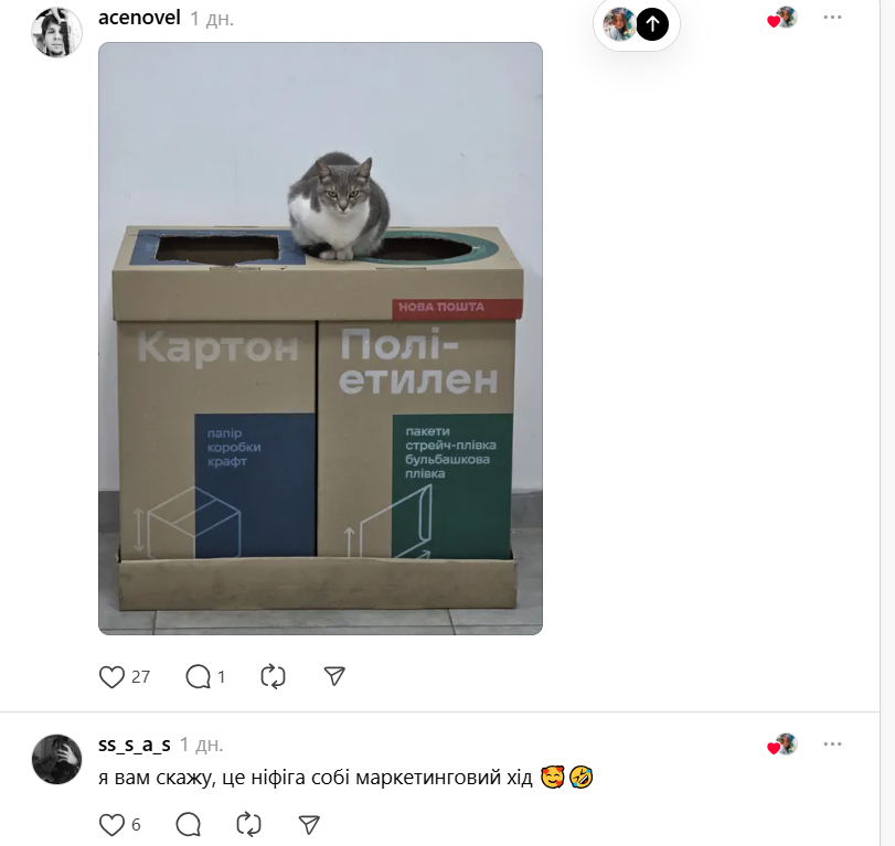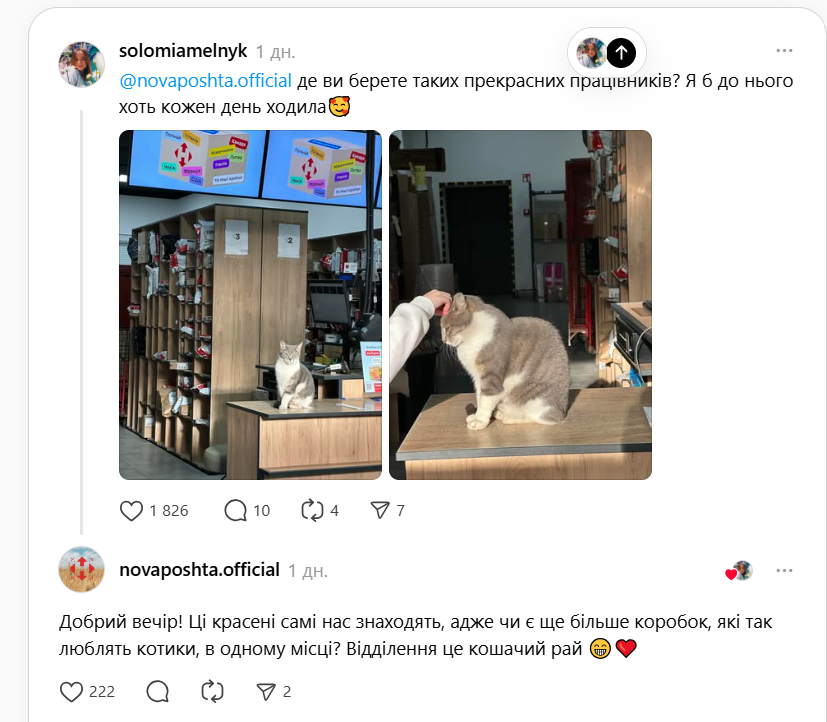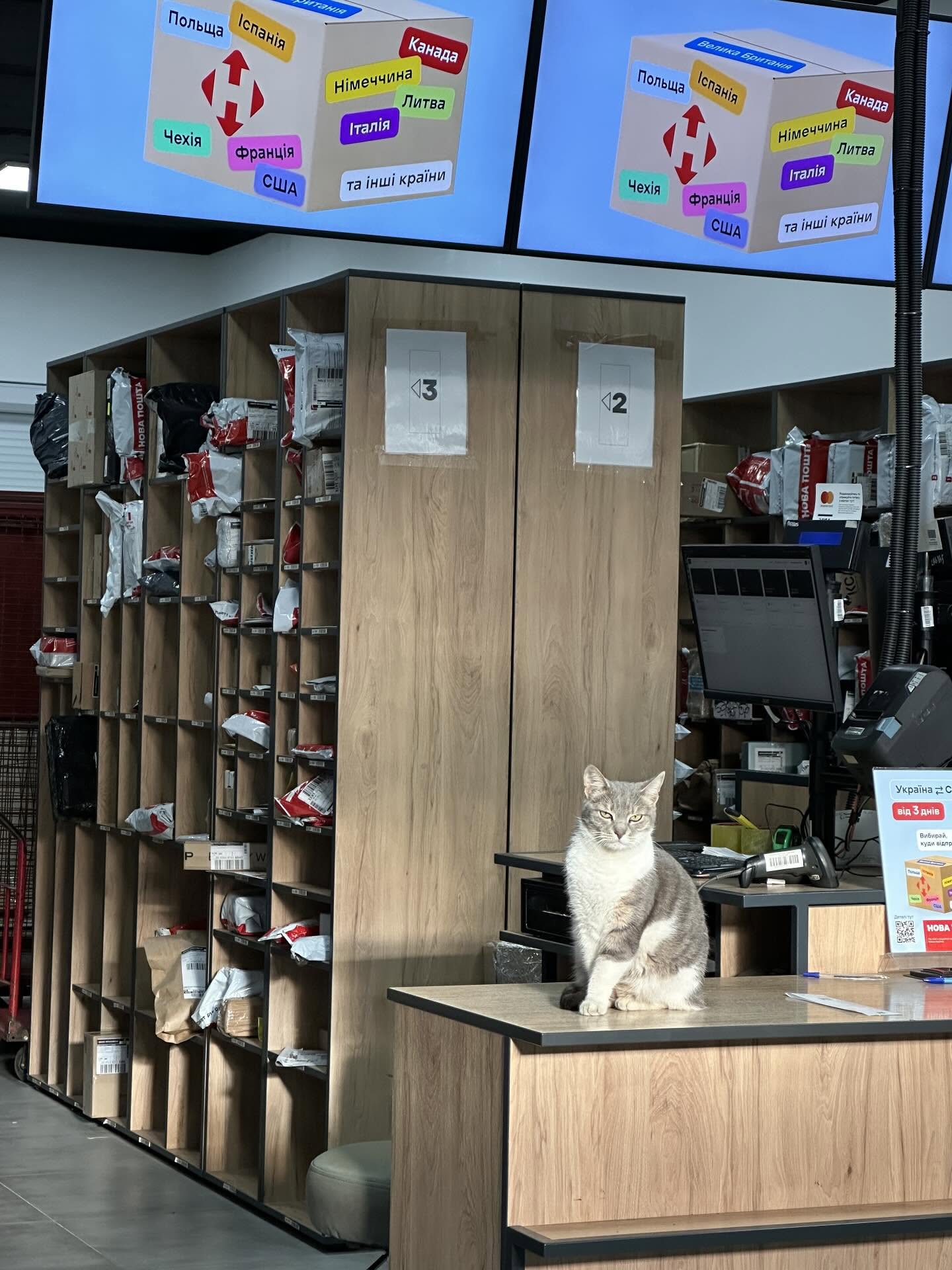 Користувачка Соломія Мельник у Тредс опублікувала фото сіро-білого кота на місці оператора і запитала, де таких співробітників знаходять. У компанії Нова пошта жартують, що "красені самі знаходяться", а відділення — справжній рай для котів, адже там багато коробок.