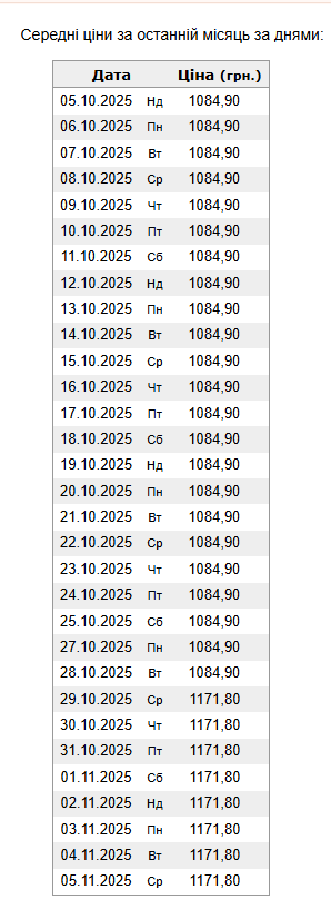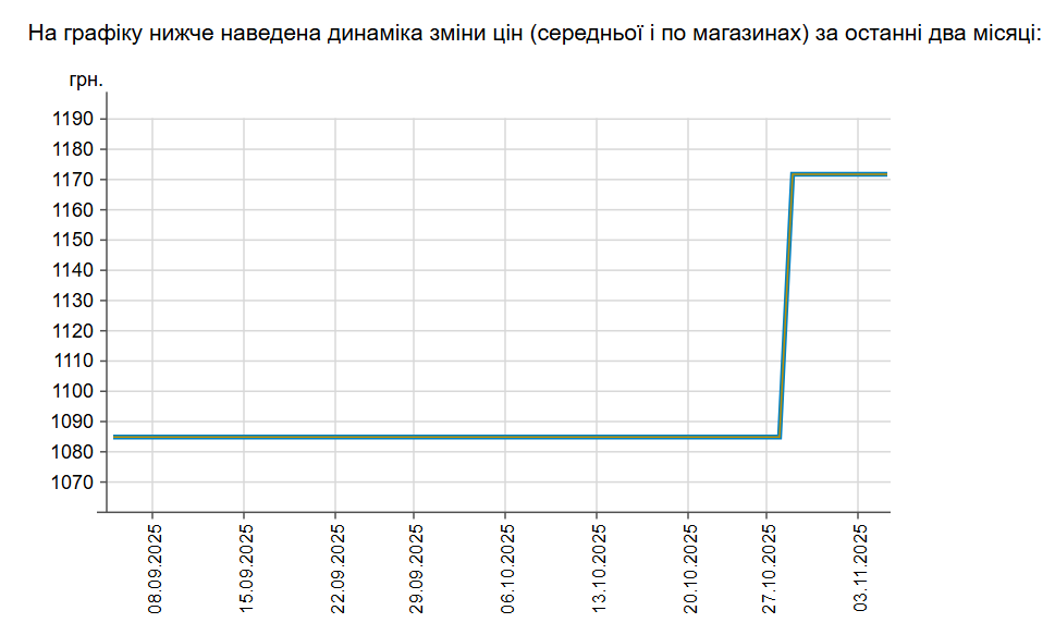 Ще 28 жовтня ковбаса коштувала 1084,90 грн, а вже наступного дня ціна злетіла до 1171,80 грн. На такому рівні вартість Брауншвейської сирокопченої лишається станом на 5 листопада. Таким чином, за минулий місяць, з 05.10.2025, середні ціни зросли на 86,90 грн.