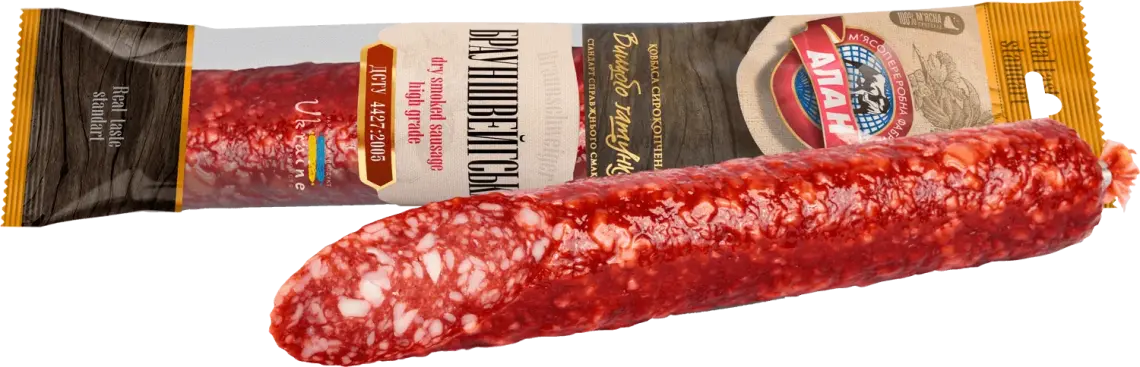 Виробник цієї ковбаси — ТОВ "АЛАН" з Дніпра. У складі — 100% м'ясної сировини (яловичина та свинина).