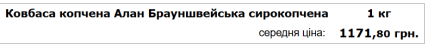 Середня ціна Брауншвейської сирокопченої 1171,80 грн за кілограм. Тоді як протягом жовтня середні ціни на неї в магазинах були 1093,89 грн.