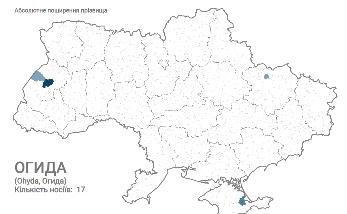 На карті зазначено, що носії прізвища Огіда проживають у Львові (7 осіб), Пустомитівському районі (6 осіб) та Яворівському районі Львівської області (1 особа), у Харкові (одна людина), у Криму (2 особи).