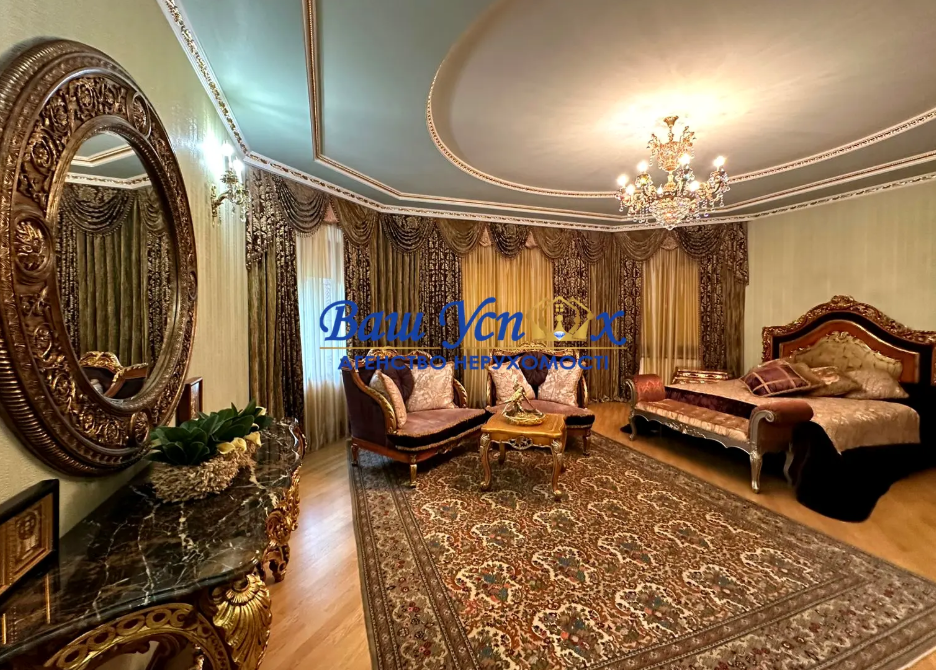 Основний будинок: 2 гостьові зали на двох поверхах, кухня-їдальня, ігровий дитячий зал, вітальня з каміном, більярдна кімната, дитяча, кабінет, спа-зона, кабінет косметології, чотири спальні та вбиральні кімнати. Усі спальні, кабінет та гостьовий зал мають вихід на тераси.