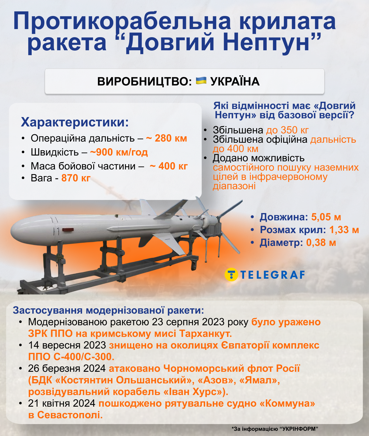 На озброєнні ЗСУ є цікава крилата ракета "Довгий Нептун", якою Україна успішно атакує військові об’єкти у Росії. Це наземна модифікація легендарної протикорабельної крилатої ракети, яка потопила крейсер "Москва".