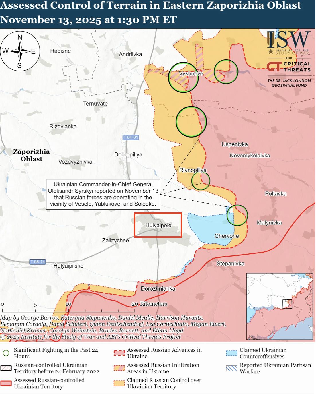Російські війська посилюють наступальні операції за напрямами Гуляйполя (Запорізька область) та Великомихайлівки (Дніпропетровська область). На руку ворогові грає погана погода, яка перешкоджає операціям українських безпілотників, а також попередні удари по українській тиловій логістиці. Про це йдеться у новому звіті Інституту вивчення війни за підсумками 13 листопада.