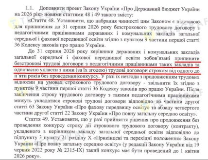 При цьому народний депутат наголосив, що фактично про звільнення не йтиметься й порадив уважніше прочитати запропоновану норму. А пропозиція профільного комітету викладена так: "До 31 серпня 2026 року керівники … зобовʼязані припинити безстрокові трудові договори з педагогічними працівниками таких закладів та ОДНОЧАСНО УКЛАСТИ З НИМИ (за їхньою згодою) трудові договори строком 1-5 років без проведення конкурсу".