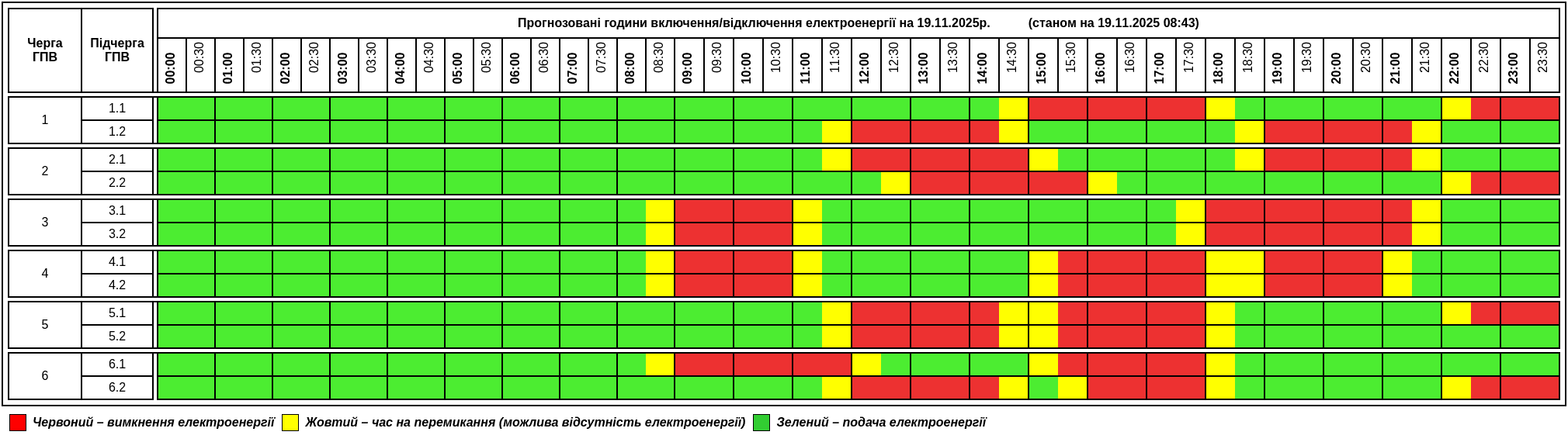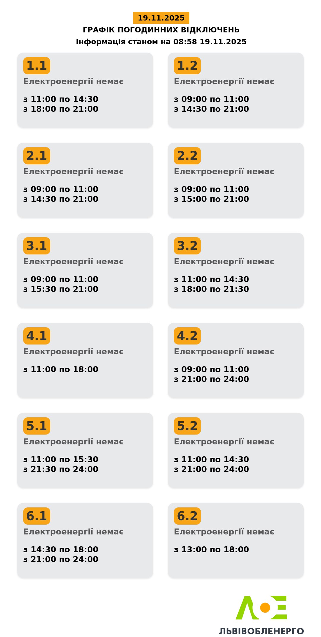 ГАВ — це графіки аварійних вимкнень, які застосовуються екстрено в разі дефіциту обсягів електроенергії. Вони не мають визначеної тривалості та скасовуються лише після відповідної вказівки. На час їхньої дії графіки погодинних відключень не діють. Зранку 19 листопада їх запроваджували у Івано-Франківській, Львівській, Тернопільській та Волинській областях. Зараз всі регіони повернулися до погодинних графіків.