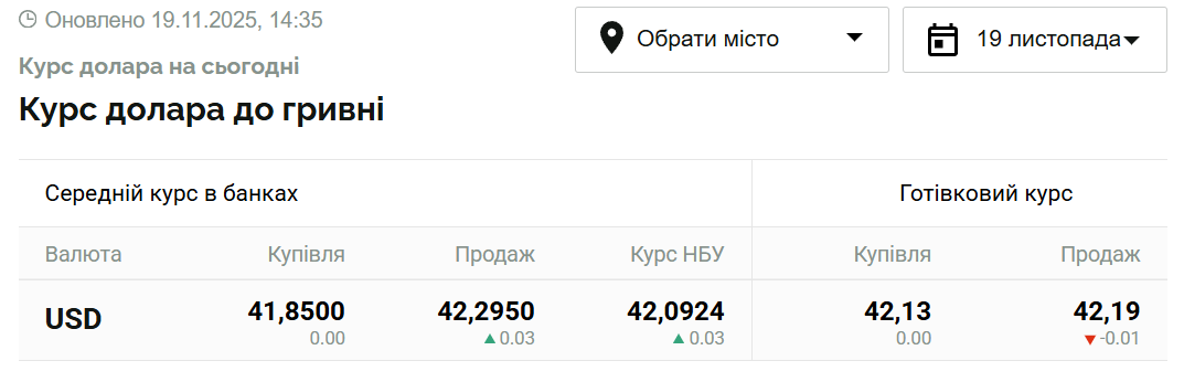 - Курс НБУ 19 листопада — 42,13 грн купівля та 42,19 грн продаж