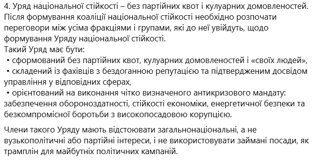 • орієнтований на виконання чітко визначеного антикризового мандату: забезпечення обороноздатності, стійкості економіки, енергетичної безпеки та безкомпромісної боротьби з високою корупцією.
