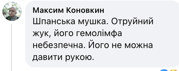 "Шпанська мушка. Отруйний жук, його гемолімфа небезпечна. Його не можна давити рукою", — написав в коментарях Максим Коновкін.