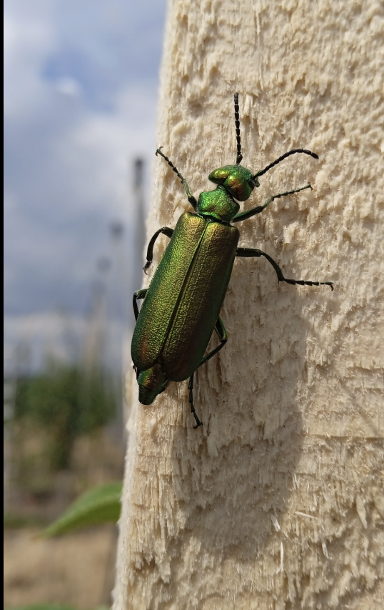 На зображені показано комаху з продовгуватим тілом зеленого кольору з металевим відблиском. Жук має досить довгі вуса та лапки, темного кольору. У коментарях люди наголошують, що це отруйний жук.