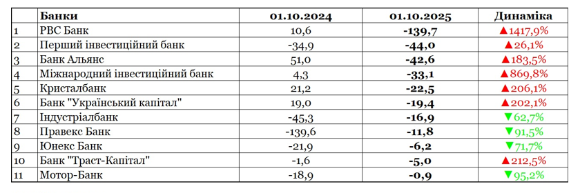 Як видно із таблиці, п’ять із 11 збиткових банків торік ще демонстрували прибуткову діяльність, а тепер пасуть задніх. При цьому чотирьом банкам, які в 2024-му були у мінусах, вдалось хоч трохи скоротити свої збитки.