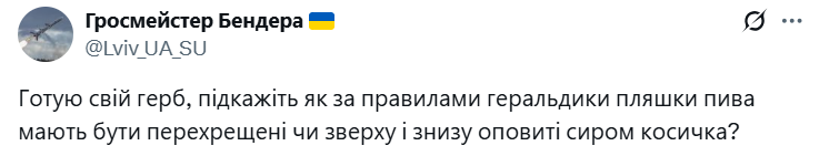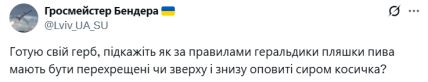 "Готую свій герб, підкажіть як за правилами геральдики пляшки пива мають бути перехрещені чи зверху і знизу оповиті сиром косичка?", — сміються у мережі.