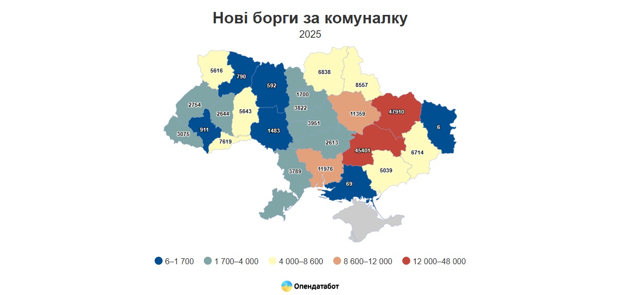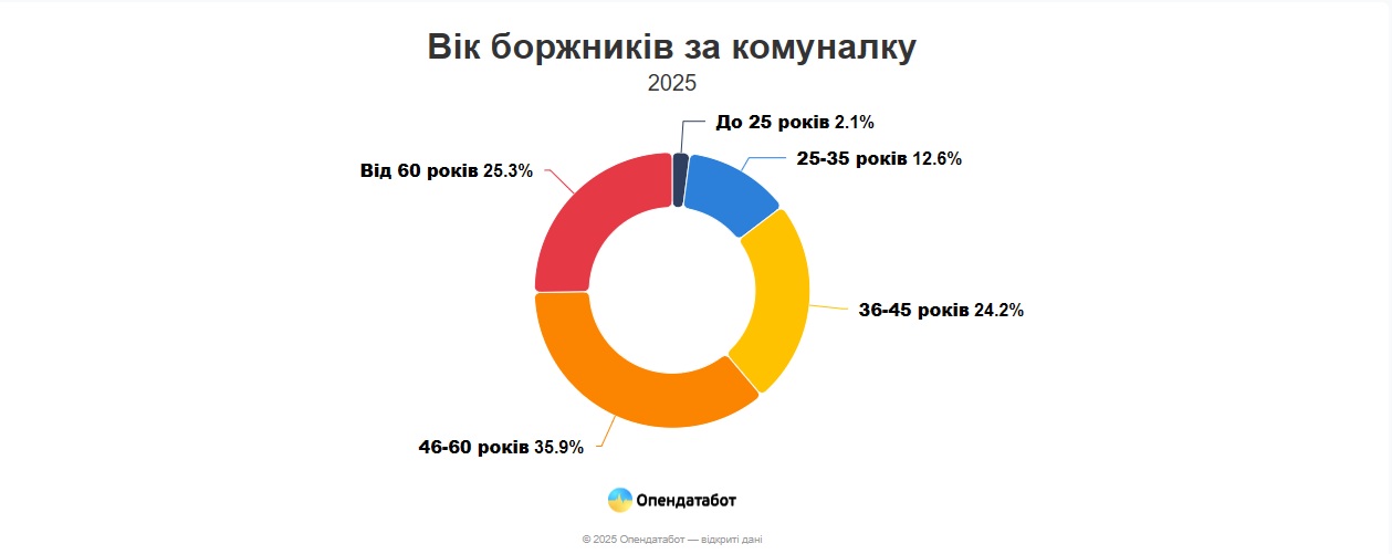 Згідно з даними аналітиків, у 40% випадків українці в 2025 боргують за теплопостачання. На другому місці водопостачання (18%), далі — газопостачання (15%) та житлове обслуговування (10%). На вивіз сміття та електроенергію припадає по 8% і 6% відповідно.