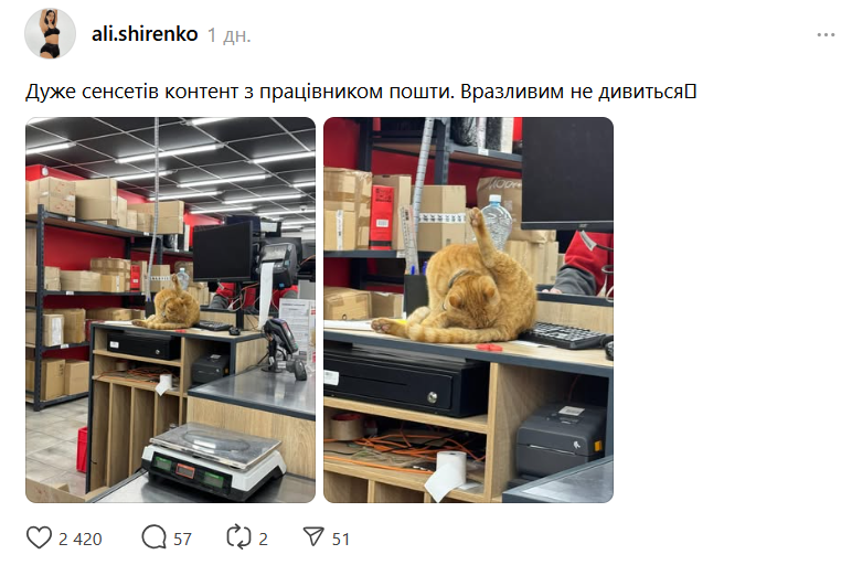 В соцмережі Treads став популярним допис про кота на Новій пошті. Рудого заскочили за інтимним моментом. Українські бренди та власне сама компанія долучились до обговорення.