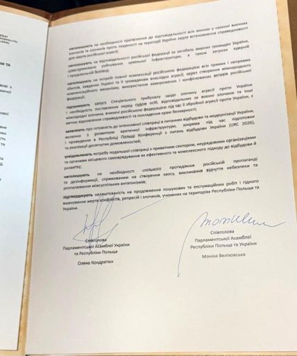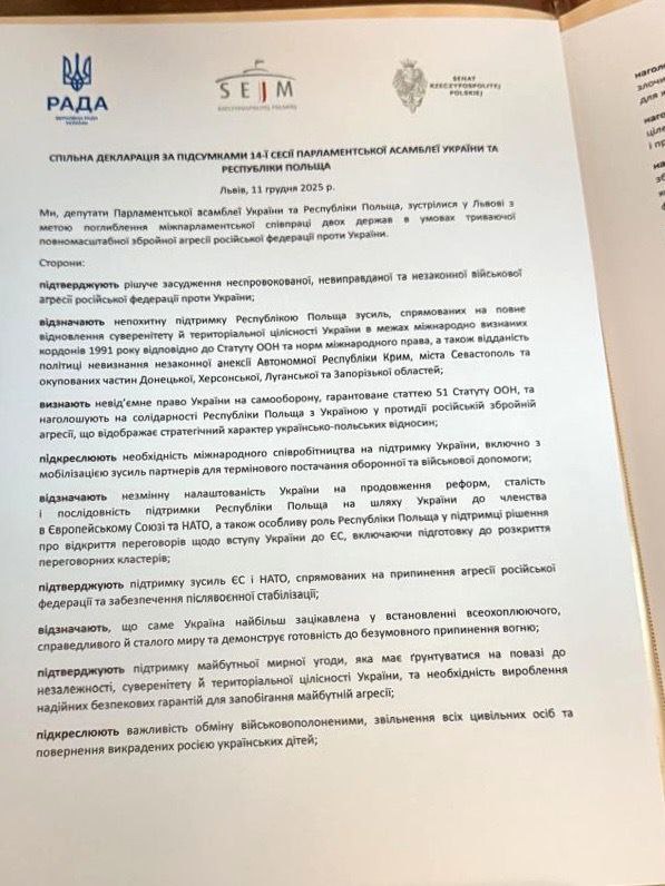 У середу, 11 грудня, у Львові відбулася 14-та Сесія Парламентської асамблеї України та Республіки Польща. За її результатами співголови Асамблеї — віцеспікерка Верховної Ради Олена Кондратюк та пані віцемаршалок польського Сейму Моніка Веліховська — підписали Спільну декларацію.