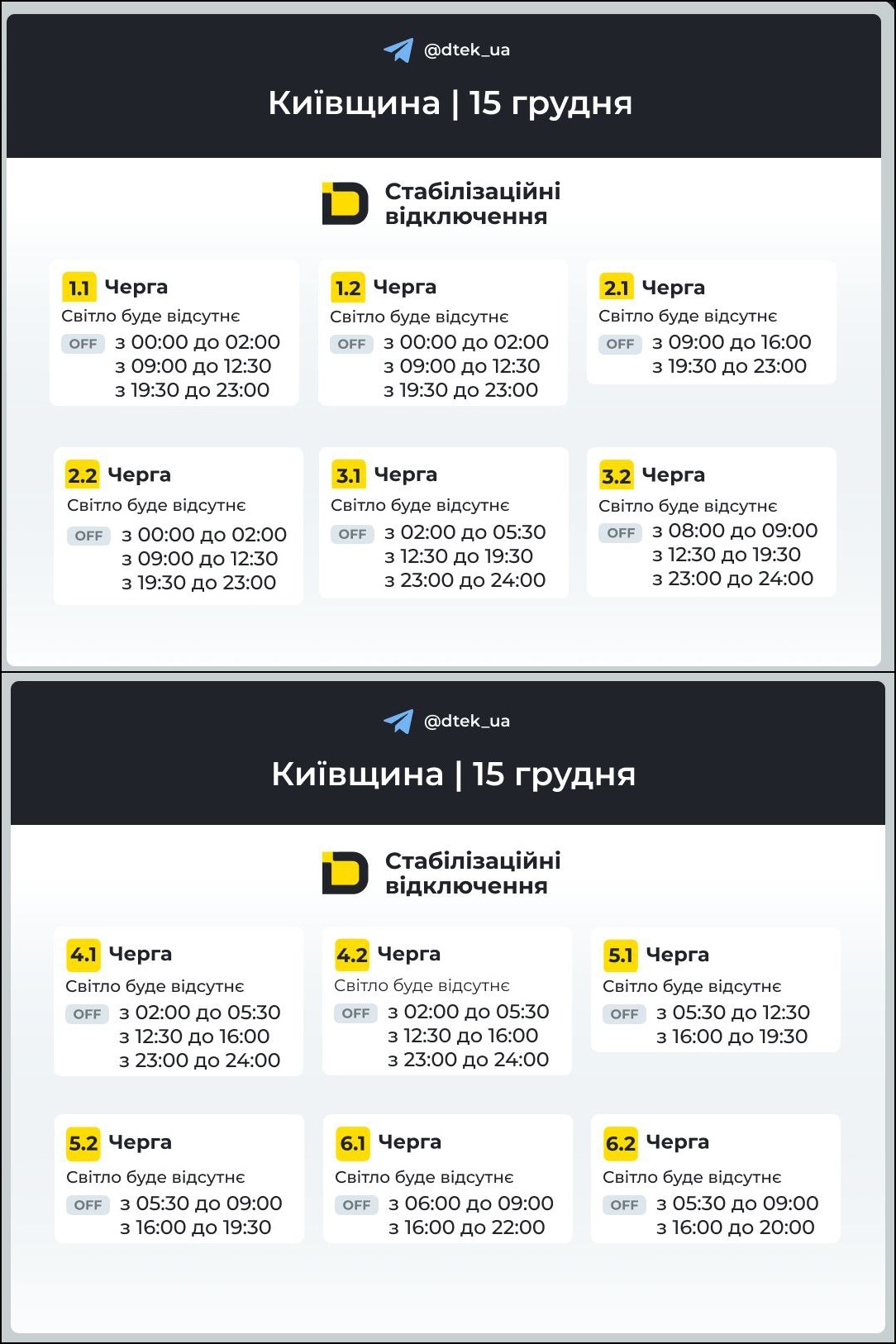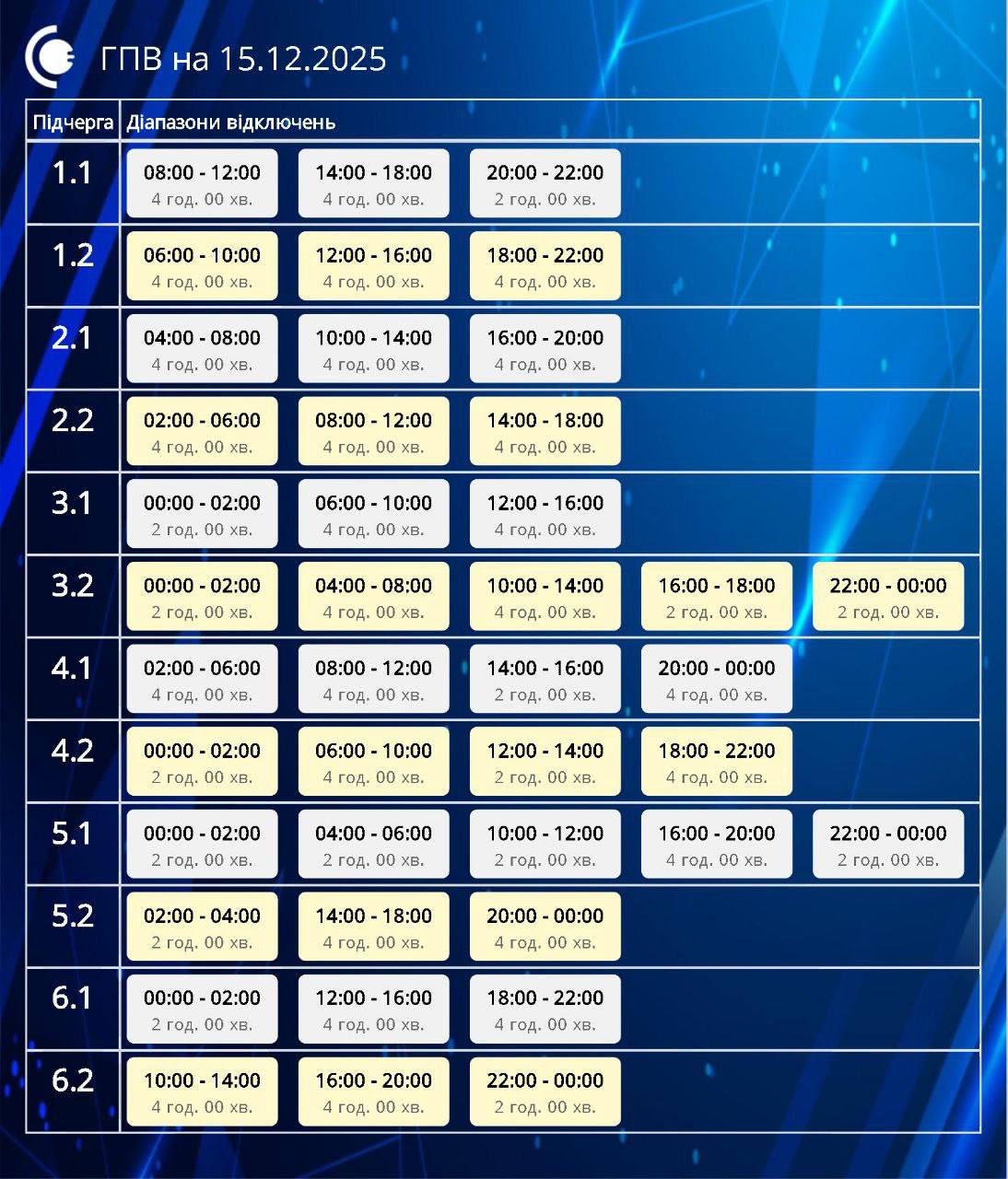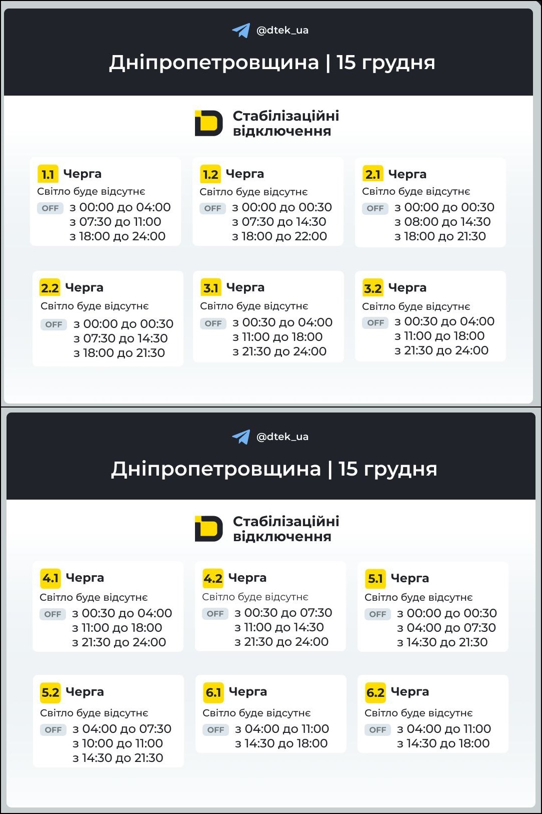 Графік відключення світла у Дніпропетровській області 15.12.2025