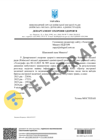 У відповіді КМДА також уточнили, що наразі окремої статистики саме щодо травм, пов’язаних із відключеннями світла, не ведуть. Дані відображають загальну кількість побутових травм у столиці за відповідні роки.