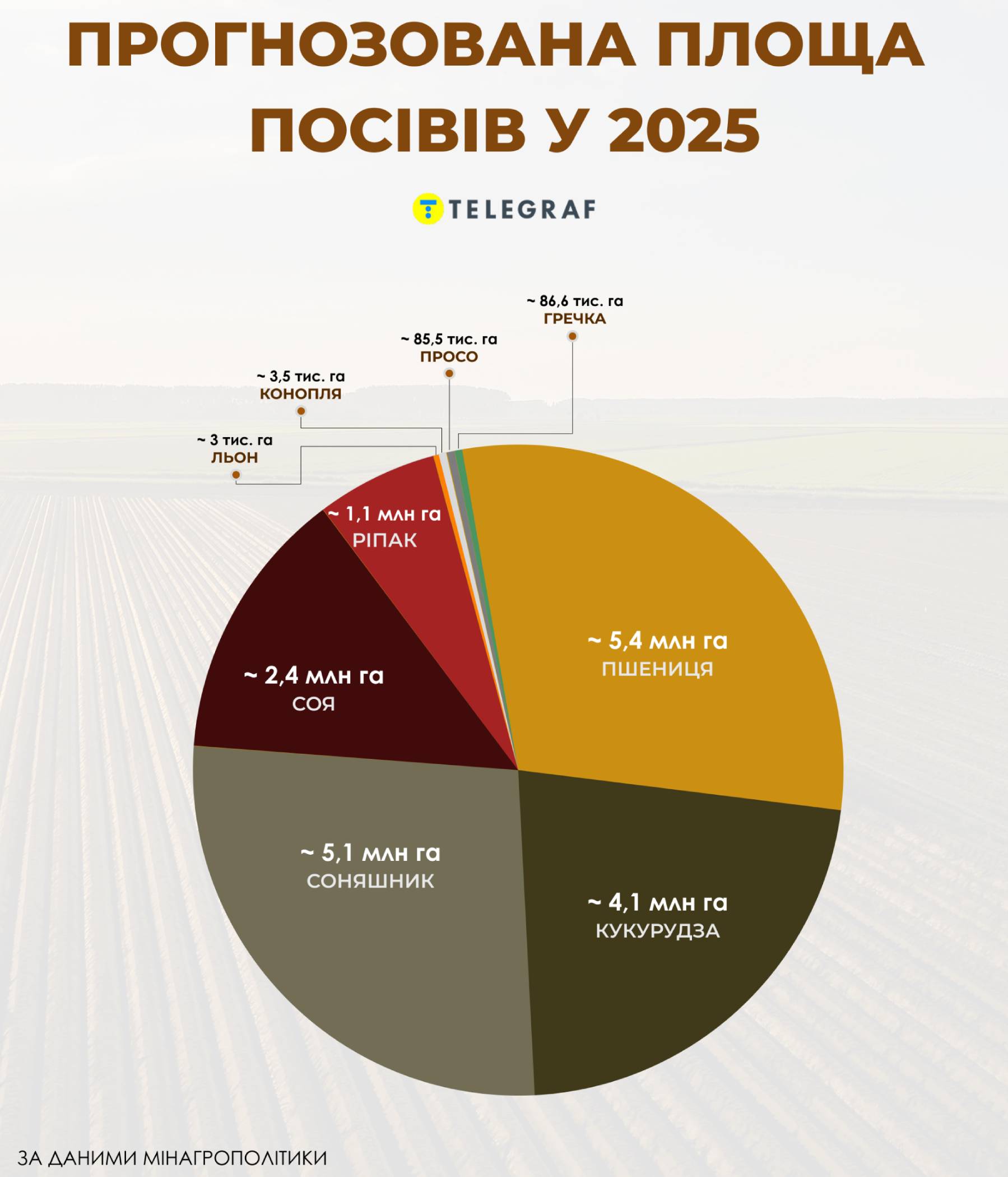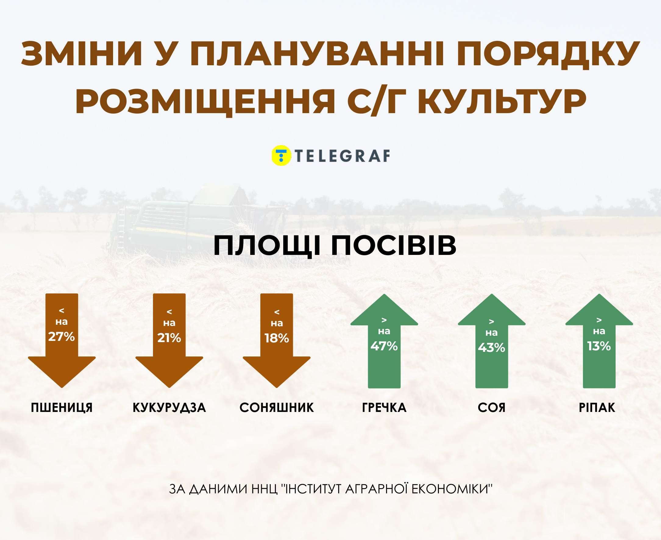 Хоча соняшник, кукурудза та пшениця надалі формують основу вітчизняного агропромислового комплексу, за останні роки структура посівів вже зазнала змін. Площі під традиційними культурами скоротилась приблизно на п'яту частину, а саме на 27% менше стало посівів пшениці, на 21% – кукурудзи, на 18% – соняшника.
