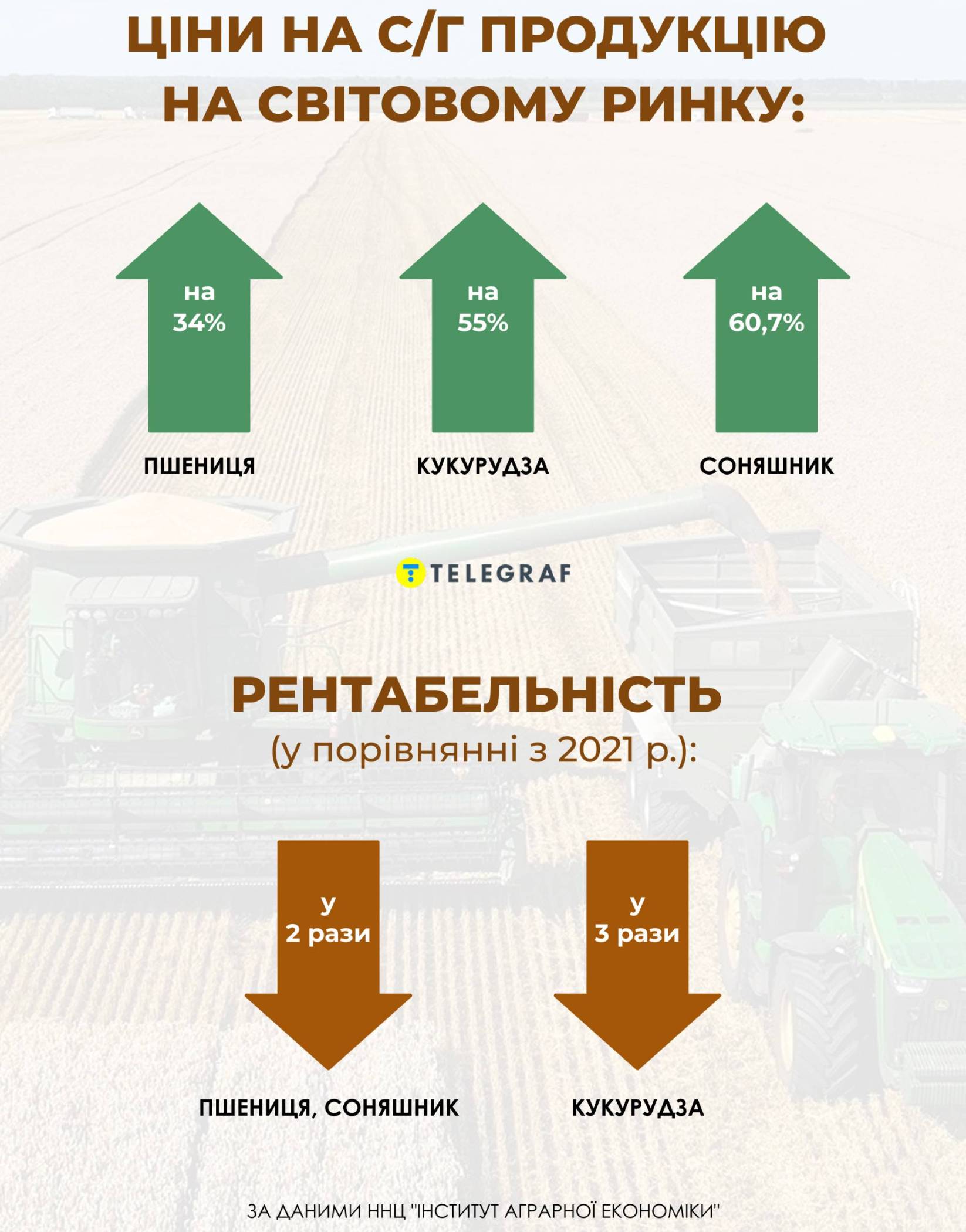 На фоні зростання цін на сільськогосподарську продукцію на світовому ринку – від 34,9% на пшеницю до 60,7% на соняшник – рентабельність цих культур помітно зменшується. Зокрема, вдвічі у порівнянні з довоєнним 2021 року по пшениці та соняшнику, та утричі – по кукурудзі. Високі прибутки наразі отримують лише великі аграрні холдинги, констатують в ННЦ "Інститут аграрної економіки". Адже мають меншу собівартість виробництва завдяки власній логістиці та переробці.