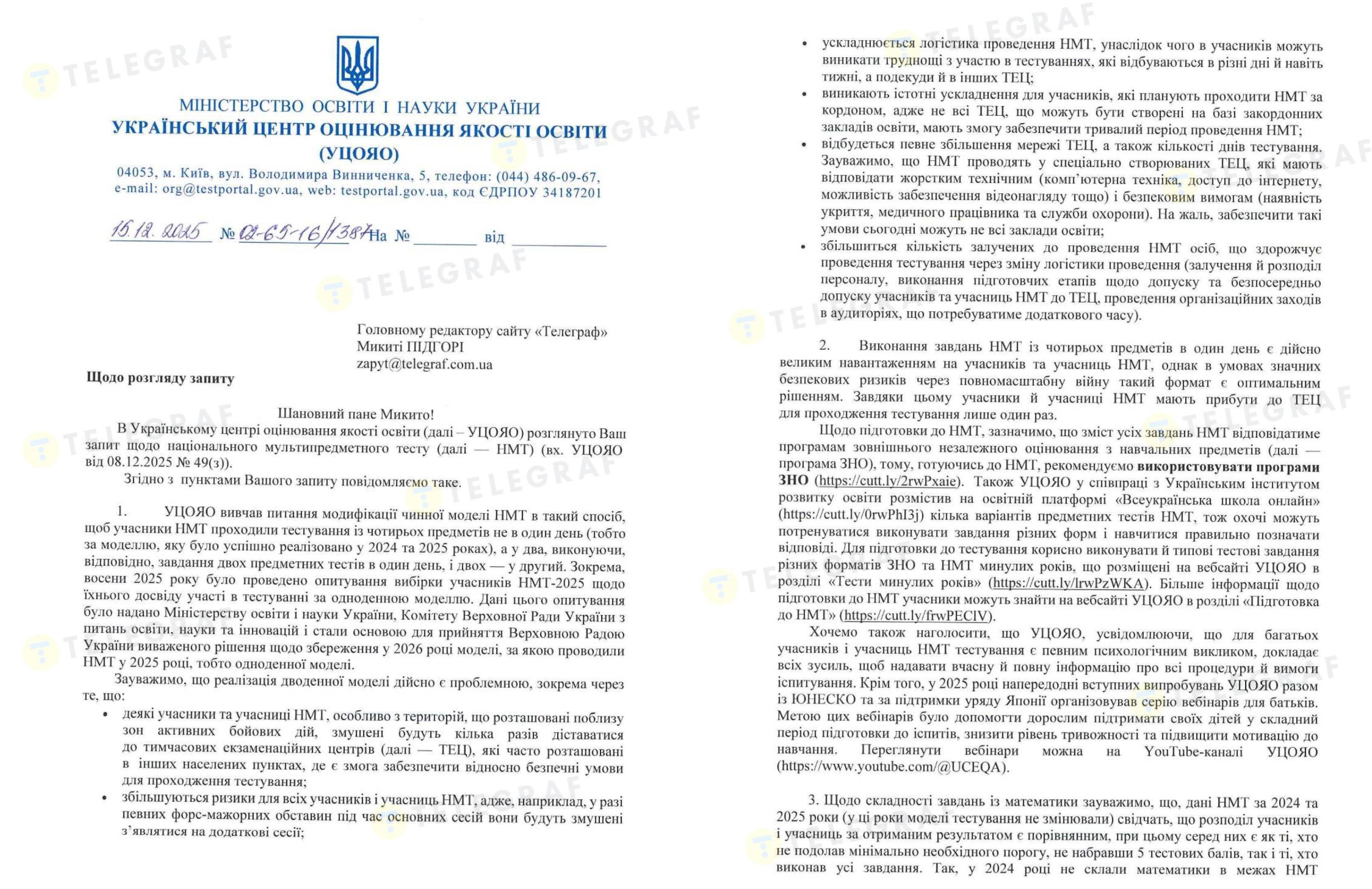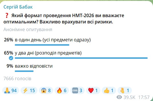 "Телеграф" поцікавився в Українському центрі оцінювання якості освіти: чому не почули прохання школярів та батьків переглянути формат і розділити тест на два дні. В установі пояснили: таку можливість вивчали, навіть проводили опитування. За інформацією голови Комітету Верховної Ради з питань освіти, науки та інновацій Сергія Бабака, більшість учасників нібито назвала проходження НМТ за один день більш комфортним. Натомість на ТГ-каналі нардепа зріз настроїв дав інші результати – 65%, або 4983 особи, підтримали саме дводенний формат тестування.