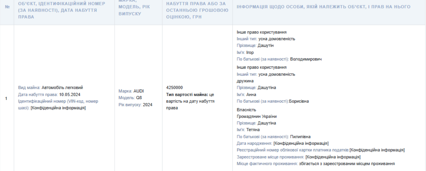 Зате його мама-пенсіонерка раптом розбагатіла. 26 вересня 2025 року 70-річна Тетяна Дашутіна стала власницею нового Audi Q3 – такий коштує близько 40 тисяч доларів.