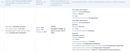 А минулого року жінка вже купила Audi Q8 2024 року випуску вартістю близько 100 тисяч доларів. Цікава деталь: жінка живе у селі Рябина на Сумщині, але новий автомобіль зареєструвала чомусь у Києві.