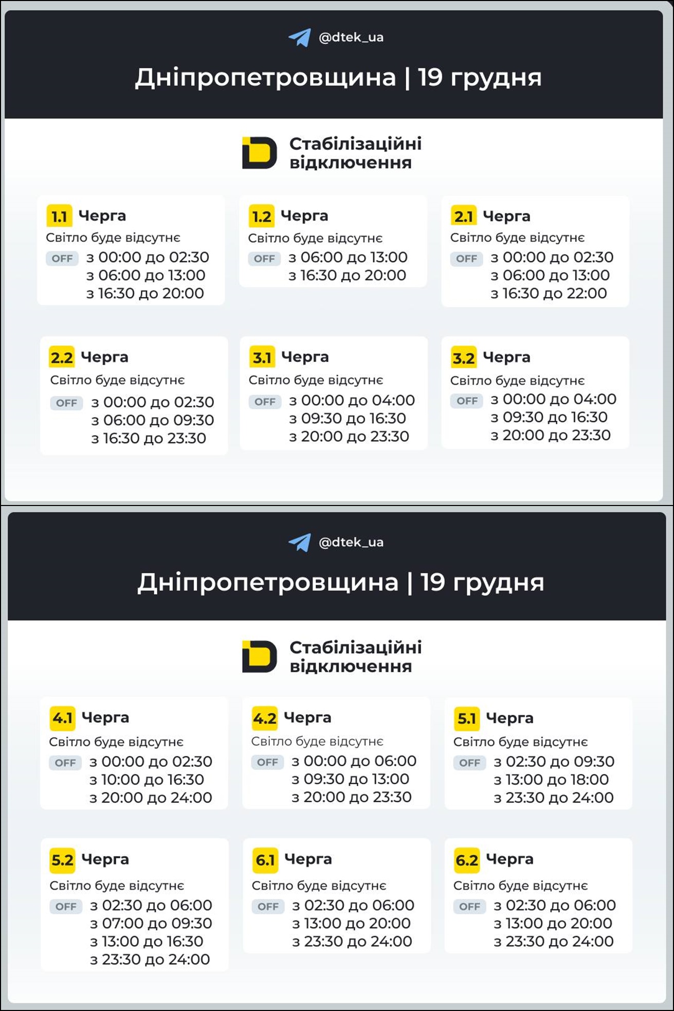 Графік відключення світла у Дніпропетровській області 19.12.2025